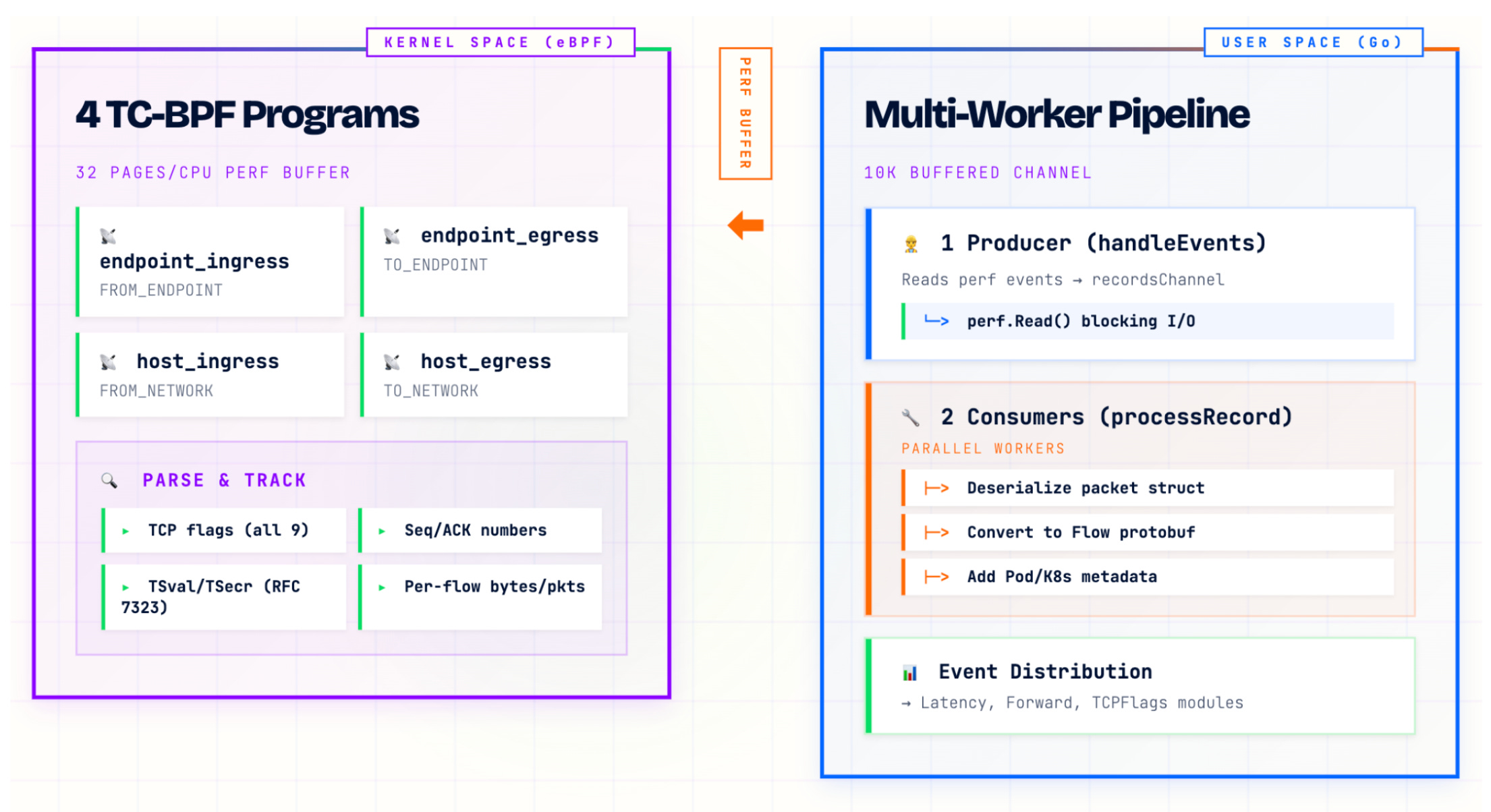 Let’s examine how modern eBPF observability tools transfer data from kernel to user space, using Microsoft Retina as our case study. Retina’s packetparser plugin showcases a common architecture in eBPF network monitoring: