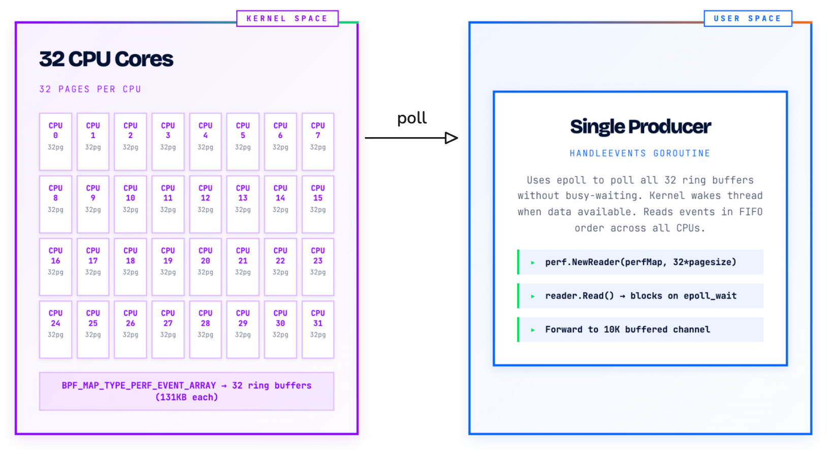 Even with perfect CPU isolation, the architectural overhead of polling 32 separate memory regions via Perf Arrays prevented us from reaching acceptable performance.